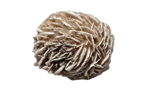 Desert Rose is a natural delicate cluster of gypsum (calcium sulfate) or baryte (barium sulfate) crystals. The stone has a rosette shape with fanned-out, flat crystal blades (petals) that incorporate sand, giving it a sandy, earthy look.