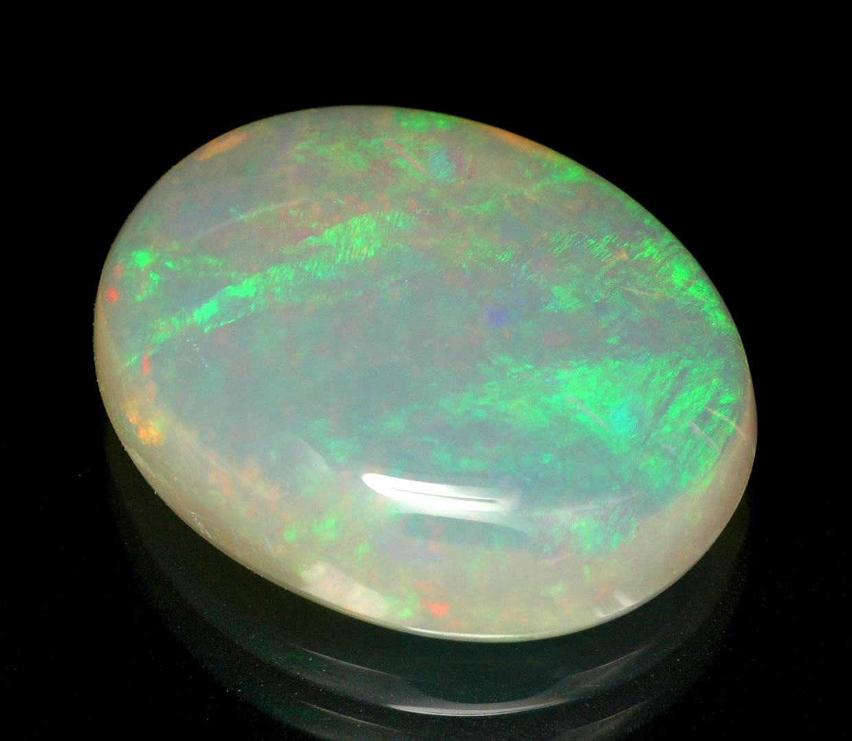 “Precious Opal” – this is the material with the internal “color play”, “flash”, or “light show”. It is classified by its back ground color, the particular colors and intensity of color display, and its size. Stones that are predominantly white or light blue are the most common, and those that contain reds, oranges, and violets are considered more desirable. Blue and green are very common in most precious opal. Black opal, opal containing a predominantly dark background (dark-gray to blue-black) is the rarest, and most desired of all opals. When it contains reds and oranges it brings even a higher value. It may be priced right up with the top gemstones (diamond, emerald, and ruby). The very best black opal came from Lightening Ridge. Australia and small amounts till reach the market today, but there have been no major finds in many years.
